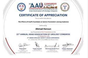 أعلنت الرابطة العربية لجراحي المسالك البولية والتناسلية قبول دراسة سودانية رائدة للدكتور أحمد هارون، تتناول التأثيرات السلبية لاستخدام مادة التمباك (المعروفة محلياً باسم “الصعود”) على جودة السائل المنوي وخصوبة الرجال.