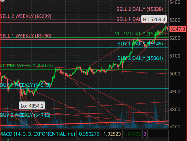 وفقًا لنموذج VC PMI، فإن استمرار التداول أعلى مستوى 5299 دولارًا يعزز احتمالات التوسع نحو نطاق 5338 – 5450 دولارًا. في المقابل، فإن الفشل في الثبات فوق 5200 دولار قد يدفع الأسعار إلى تصحيح هابط باتجاه منطقة الدعم الأولى قرب 5145 دولارًا.